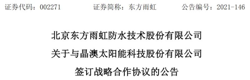 目前,东方雨虹依托现有的TPO等产品及BIPV屋面系统,与安徽信义电源有限公司、晶澳科技等分布式光伏屋面上下游企业陆续开展技术、业务等方面合作。