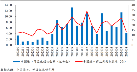 2023年6月,荷兰政府颁布出口管制条例(2023年9月1日生效),对光刻设备的限制包括EUV光罩保护膜和EUVpellicle生产设备;DUV方面,限制最小可分辨特征尺寸(MRF)45nm以下且最大DCO值小于或等于1.50nm的光刻机。2024年1月2日,荷兰政府部分撤销了此前颁发的NXT:2050i和NXT:2100i光刻机在2023年发货的出口许可证。2024年9月,荷兰政府发布更新后的条例,ASML后续需要向荷兰政府而非美国政府申请出口许可才能出货其TWINSCANNXT:1970i和1980iDUV浸没式光刻系统。从2023年6月起,中国大陆进口荷兰光刻机金额和数量提升,主要为国内先进逻辑、存储产线扩产做准备。基于国际形势的变化,也为了满足国内高端芯片代工自给化的需求,光刻设备及零部件国产化的重要程度持续提升。