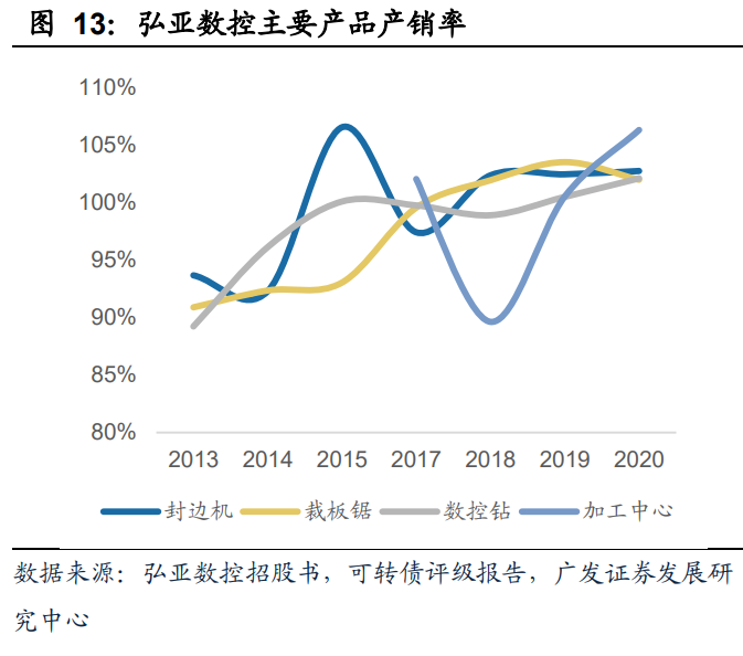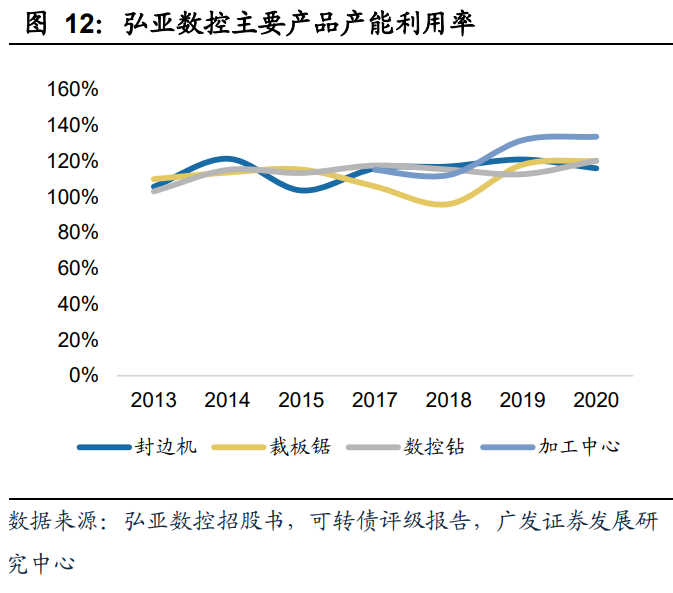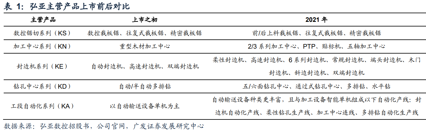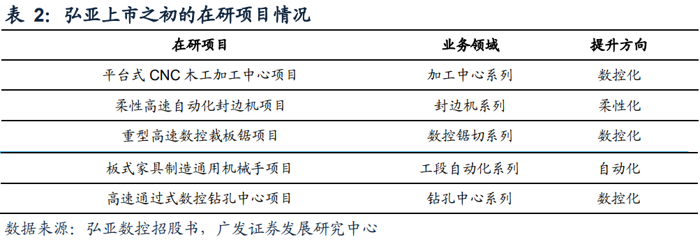 公司从产品力提升广度看,产品呈现柔性化、数控化、自动化的发展趋势。这一点在弘亚上市之初的在研项目中即得到了体现,自动化是最底层,解放人工、引入机器生产即为自动化,数控则在自动化的基础上增加了数字信号控制的元素,加工效率、稳定性以及精密度得到了显著的提高。若加工系统在数控化生产的前提下含智能分流、分配的工艺过程,则可以认为具备柔性化生产的能力。