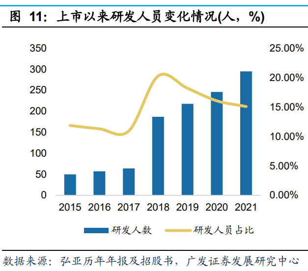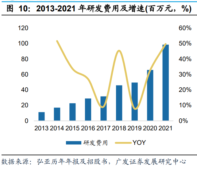 高研发投入赋能,并购项目技术整合成效显著,以市场为导向,持续推进技术升级,大力提升公司技术研发能力和自主创新能力,提高产品附加值。2013年以来,公司研发投入由11.25百万元增长至2021年的接近1亿元,复合年均增长率为31.17%,研发人员占比达到20.28%。