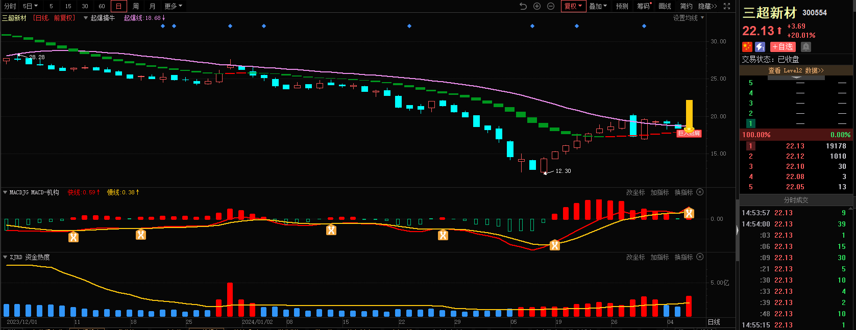3)参考技术指标:三超新材-起爆擒牛指标-出现巨人抬肩信号