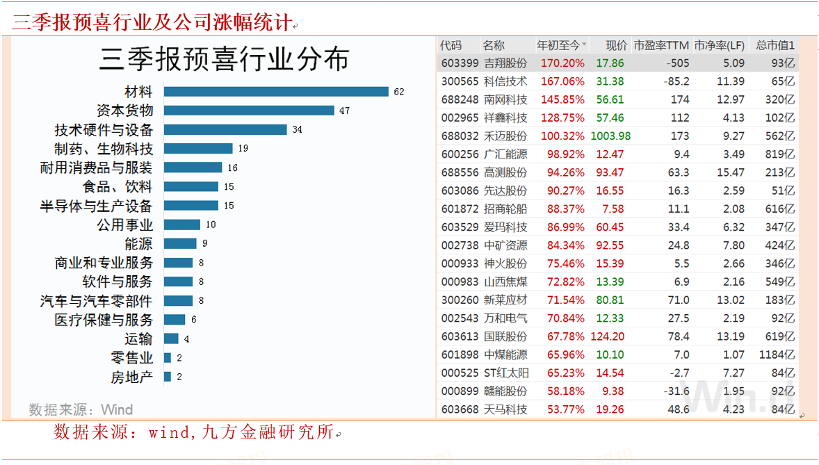 符合强制性披露条件的公司三季度业绩预告在10月15日之前披露完毕。据Wind数据统计,截至10月15日,两市共有295家上市公司披露前三季度业绩预告。2022年在大盘连续调整之际,在这266家预喜公司中,接近6成公司上涨,118家公司下跌。