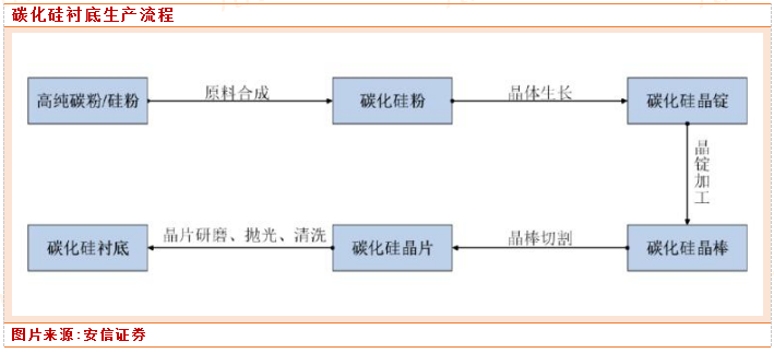 碳化硅衬底的制作流程一般包括原料合成、晶体生长、晶锭加工、晶棒切割、晶片研磨、抛光、清洗等环节。其中晶体生长阶段为整个流程的核心,决定了碳化硅衬底的电学性质。