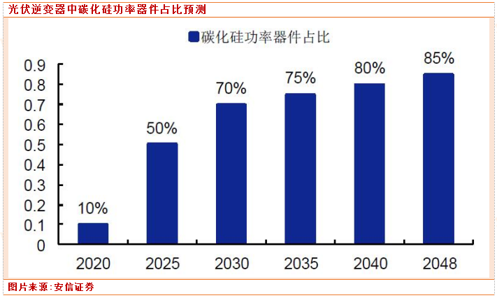 近年来,越来越多的公司投资碳化硅光伏逆变器,追求低能耗、轻量级、高效率等,根据CASA 预测,在2048 年,光伏逆变器中碳化硅功率器件占比可达85%。