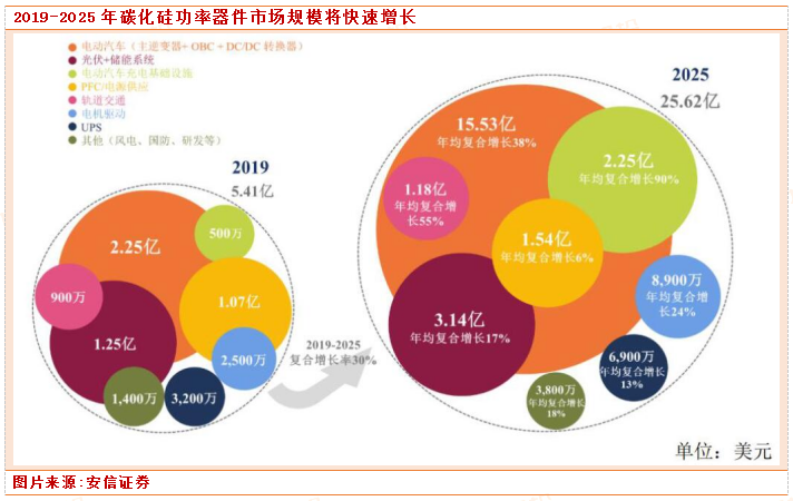 碳化硅功率器件凭借耐高压、耐高温等特点,可更加有效地应用于新能源汽车等战略领域。根据Yole 数据,2019 年碳化硅功率器件的市场规模为 5.41 亿美元,预计2025 年将增长至 25.62 亿美元,复合年增长率达 30%。碳化硅功率器件市场的高速增长也将推动导电型碳化硅衬底的需求释放。