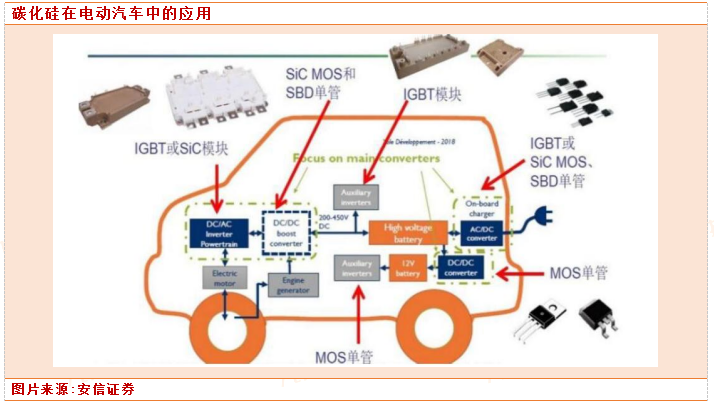 电源转换系统(车载DC/DC):车载DC/DC 变换器可将动力电池输出的高压直流电转换为低压直流电。采用碳化硅器件,设备温度积累减少,加之材料本身高导热率、耐高温的特点,散热设备可以简化,从而减小变压器体积。