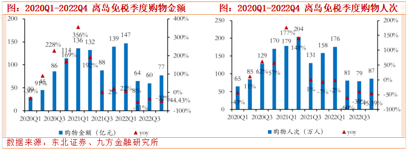 春节期间离岛免税销售火热。根据海南省旅游和文化广电体育厅统计数据,2023年春节假期,全省接待游客总人数639.36万人次/+18.2%,恢复至2019年同期的109.8%。实现旅游总收入92.98亿元/+23.5%,恢复至2019年同期的64.7%。2023年春节期间三亚凤凰机场共完成航班起降2899架次/环比+2.55%/同比+24.74%,旅客吞吐量523006人次/环比+3.86%/同比+17.03%。