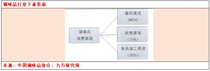 调味品行业的增长来源于下游消费的驱动,其中包括餐饮、家庭、食品加工三种渠道的驱动,各种渠道消费量占醫醋总量的比例大致为40%、30%、30%。