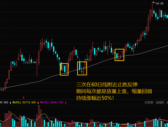 (1)股价回调至中期60日线附近的强势反弹,通常情况下表明,有主力资金在其中运作,这种个股由于主力介入较深,往往回调的幅度和时间较短,反弹的空间较大。