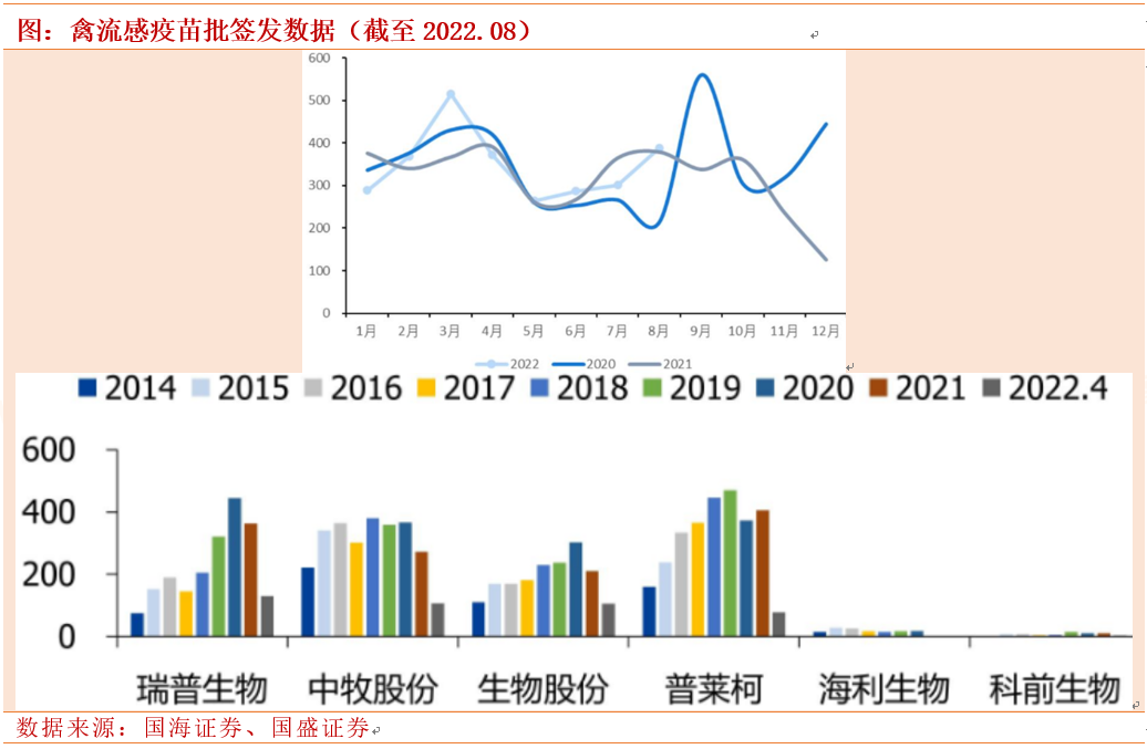 从之前的统计数据来看,瑞普生物、中牧股份、生物股份、普莱柯占据禽流感疫苗批签数量的绝大部分。其中中牧股份、科前生物猪用、禽用产品销售规模均领先。但瑞普生物、普莱柯禽用药整体毛利率较高。