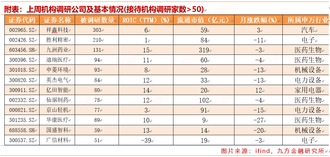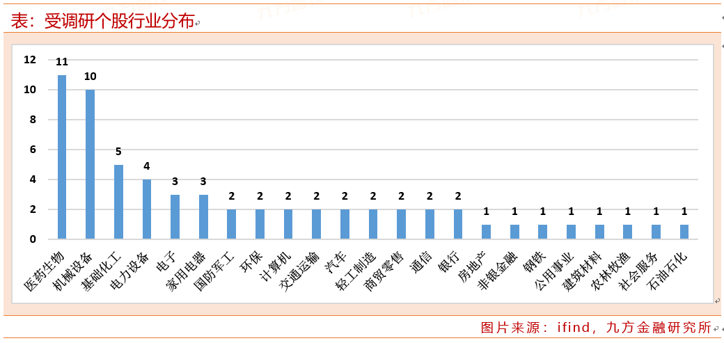从行业分布来看,本周医药生物行业有11家上市公司接受调研;随后为机械设备行业,有10家上市公司接受调研。