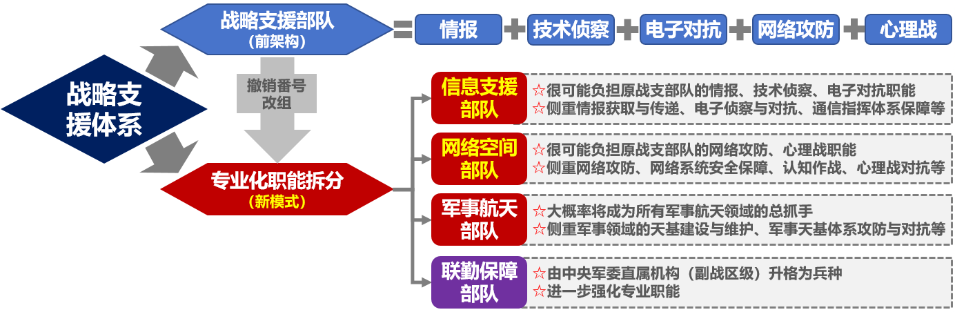 其次,结合各军兵种具体职能可能出现的分工变化,解放军大概率将进一步聚焦专业化作战能力的提升。总体上,本次军兵种的调整重点是讲原战略支援部队进行专业化拆分;新组建的兵种将进一步聚焦各自专业职能方向。我军对于相关专业领域的装备要求可能将瞄准新的高度水平。