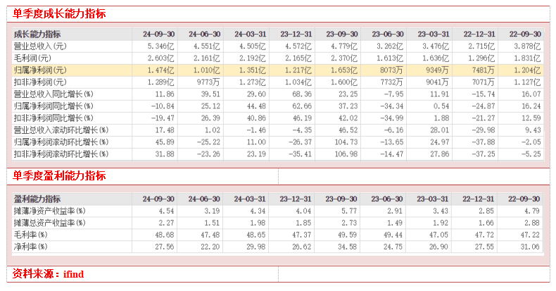 2024年前三季度公司实现收入14.4亿元,同比增加25.05%;归母净利润3.83亿元,同比增加12.95%;扣非净利润3.54亿元,同比增加7.99%。毛利率为48.29%,同比下降0.49pct;净利率为26.63%,同比下降2.85pct。