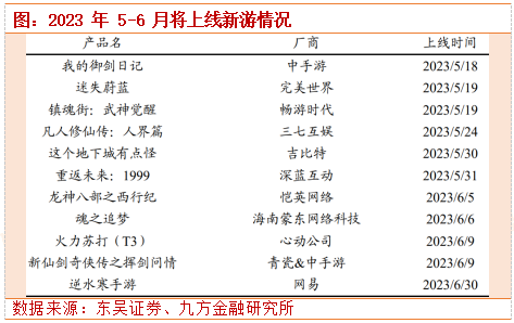 三七互娱的《凡人修仙传:人界篇》(预计 2023/5/24 上线)《扶摇一梦》等,恺英网络的《龙神八部之西行纪》(预计 2023/6/5 上线)《石器时代:觉醒》《龙腾传奇》等,心动公司的《火力苏打》(T3),创梦天地&腾讯的《二之国:交错世界》《卡拉彼丘》,金山软件的《尘白禁区》等都值得期待。同时各大厂商产品管线充沛,还储备有较多正处于版号申请阶段的优质产品,比如腾讯的《地下城与勇士手游》等、完美世界的《一拳超人:世界》《百万亚瑟王》《女神异闻录:夜幕魅影》等。