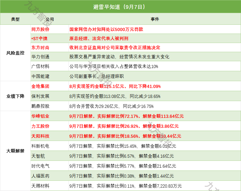 4)华峰铝业:9月7日解禁,实际解禁比例72.17%,解禁金额113.64亿元