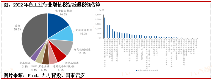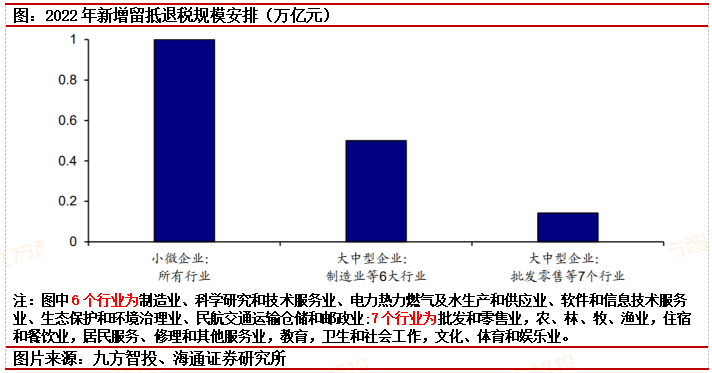 根据2022年1.5万亿留抵退税总规模推算,设备类制造业有望获得超6000亿退税,政策受益最大;上游原材料制造业则将获得退税额超2000亿;纺织(约600亿元)、农副食品加工(约500亿元)、电力(约430亿元)也是获得退税额较多的行业。