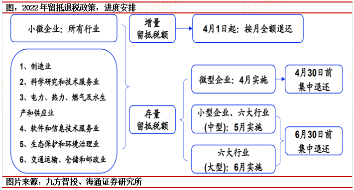 其二,聚焦制造业、科学研究和技术服务业、软件和信息技术服务业等6个重点行业。对于上述企业,增量留抵税额自4月1日起按月全额退还,存量留抵税额6月底前一次性全额退还。