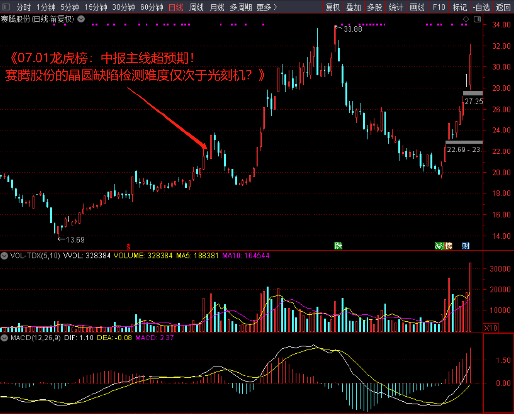 1)核心逻辑:赛腾股份,我们早在7月1日《07.01龙虎榜:中报主线超预期!赛腾股份的晶圆缺陷检测难度仅次于光刻机?》文中解析过: