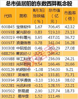 证券时报•数据宝统计,A股中布局东数西算的概念股共有42只,8月3日30股上涨,整体跑赢大盘,海量数据、华工科技、寒武纪-U涨幅居前,分别上涨6.66%、4.08%、3.71%。