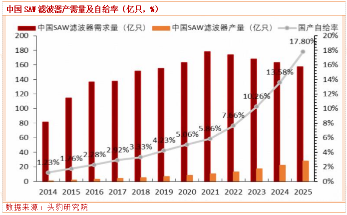 在国外巨头的长期垄断下,国产厂家合计份额在市场中占比很低,能批量供货的国产滤波器公司屈指可数。中国滤波器需求量与产量存在着巨大缺口。以SAW滤波器为例,根据智研咨询数据,2018年我国SAW滤波器产量为5.04亿只,消费量为151.2亿只,自给率仅为3.33%,预计未来国产自给率将不断上升,预计2025年有望达到17.80%,国产替代空间广阔。