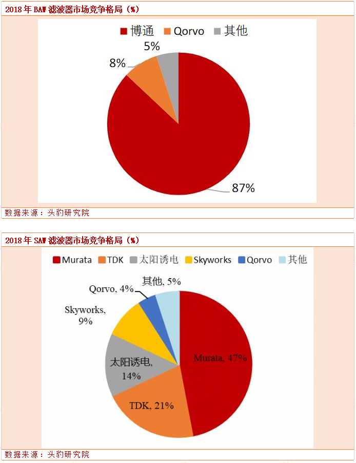 美日企业经历多次整合并购后,呈现出“强者恒强”的竞争格局。根据Yole的数据,2018年全球SAW滤波器市场主要由Murata(47%)、TDK(21%)、TaiyoYuden(14%)、Skyworks (9%)占据,合计占比达91%;