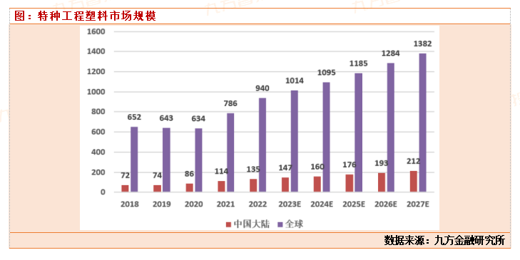 我国特种工程塑料的市场规模增长速度高于全球,预期到2027年市场规模到217亿。