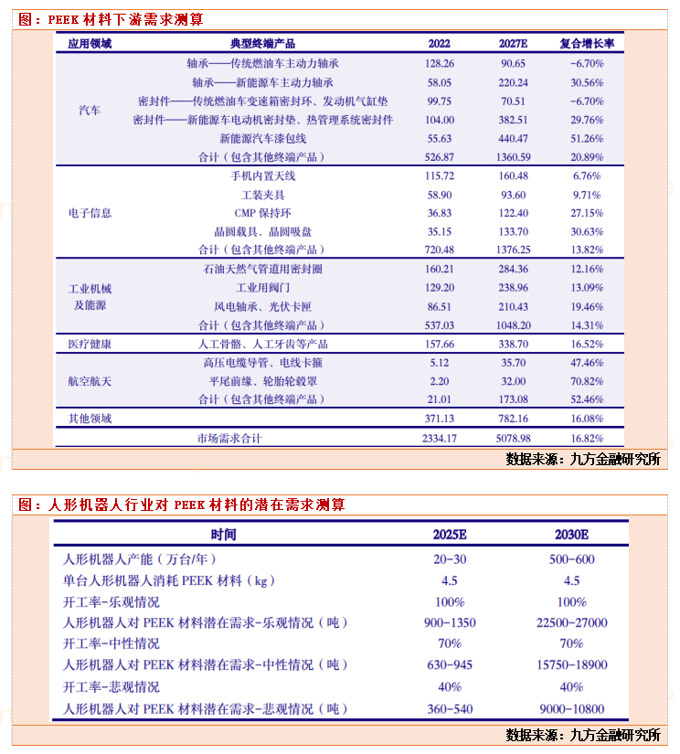 随着人工智能和人形机器人的发展,因为特种工程塑料的性能优异,比如PEEK材料,具备耐热、阻燃、耐磨、耐腐蚀等优势。PEEK材料具备耐热、阻燃、耐磨、耐腐蚀等优势。与工程塑料相比,PEEK材料兼具刚性和韧性;与金属材料相比,PEEK材料比强度大的同时,自身重量较轻,符合下游汽车领域轻量化趋势,有望实现以塑代钢。