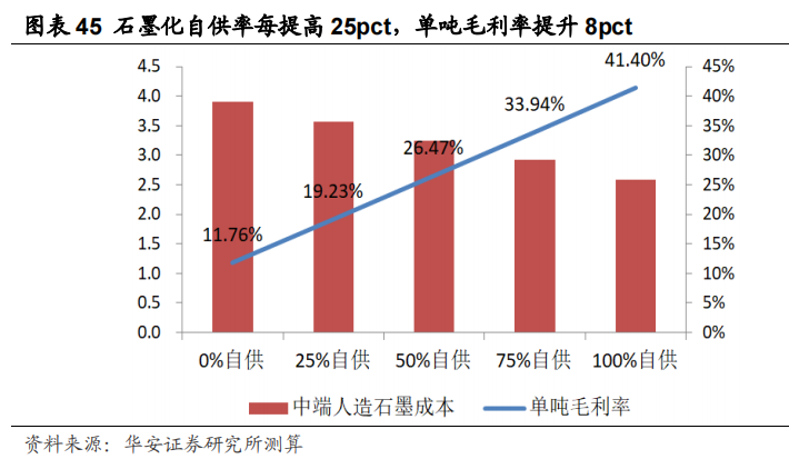 从石墨化自供率提升来看,对企业毛利率提升效果显著。数据测算可得随着自供率上升带来人造石墨成本的下降使得毛利率逐渐上升,当自供率每提高25pct,单吨毛利率将提升8pct左右。