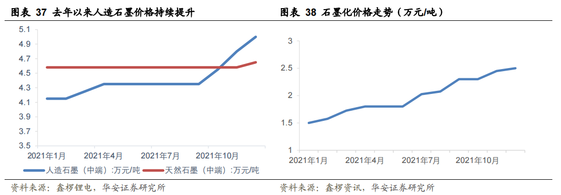 从石墨化价格看,21年因各地限产限电及能耗双控政策导致石墨化供给不足,加工费用攀升,2020年石墨化价格在1.3-1.5万元/吨,2021年8月份则达到2万元/吨,2021年末,进一步提升至2.5万元/吨。同时终端负极价格,从21年初的4.2万元/吨攀升至12月5万元/吨。