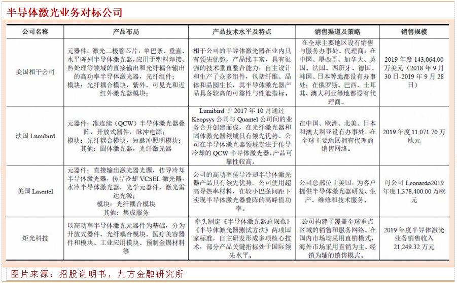 (1)半导体激光业务以高功率半导体激光元器件为基础,分为开放式器件、光纤耦合模块、医疗美容器件和模块、工业应用模块、预制金锡材料等;公司的高功率激光器应用于神光项目。