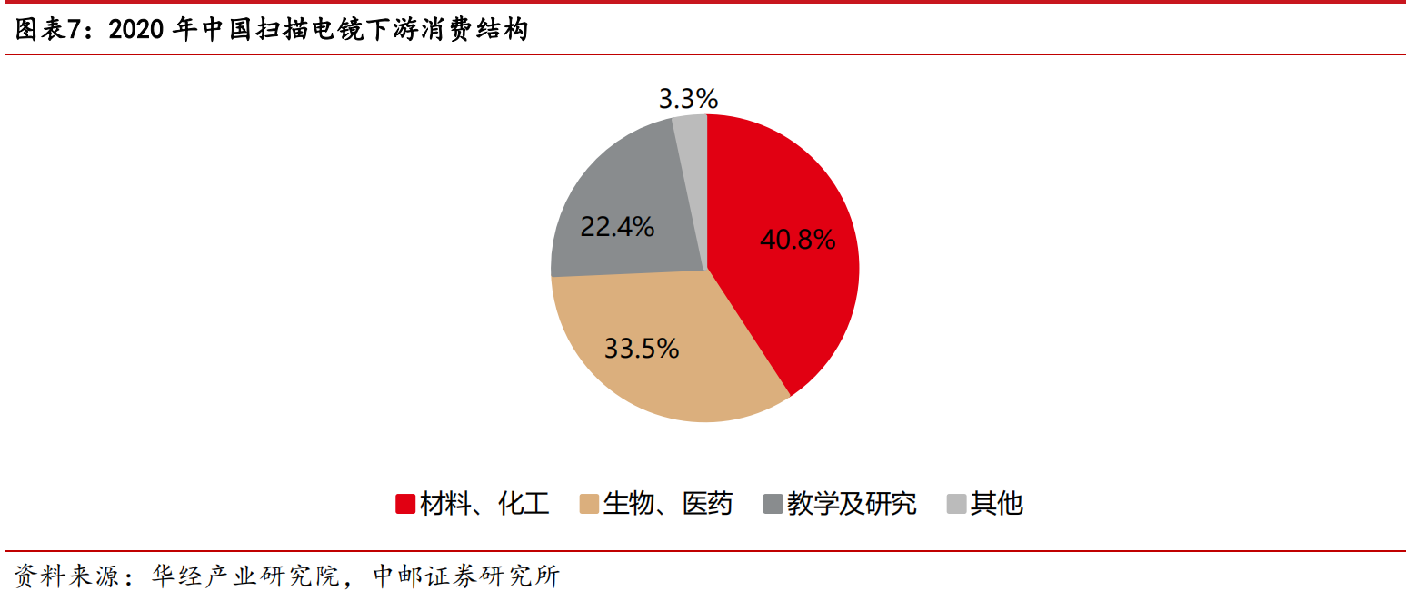 扫描电镜是一种用于高分辨率微区形貌分析的大型精密仪器,它可以利用聚焦很窄的高能电子束来扫描样品来观察物质微观形貌表征。产业链下游方面,我国的扫描电镜主要应用于纺织、化工、印染、仪器仪表、材料分析、教学科研等领域。