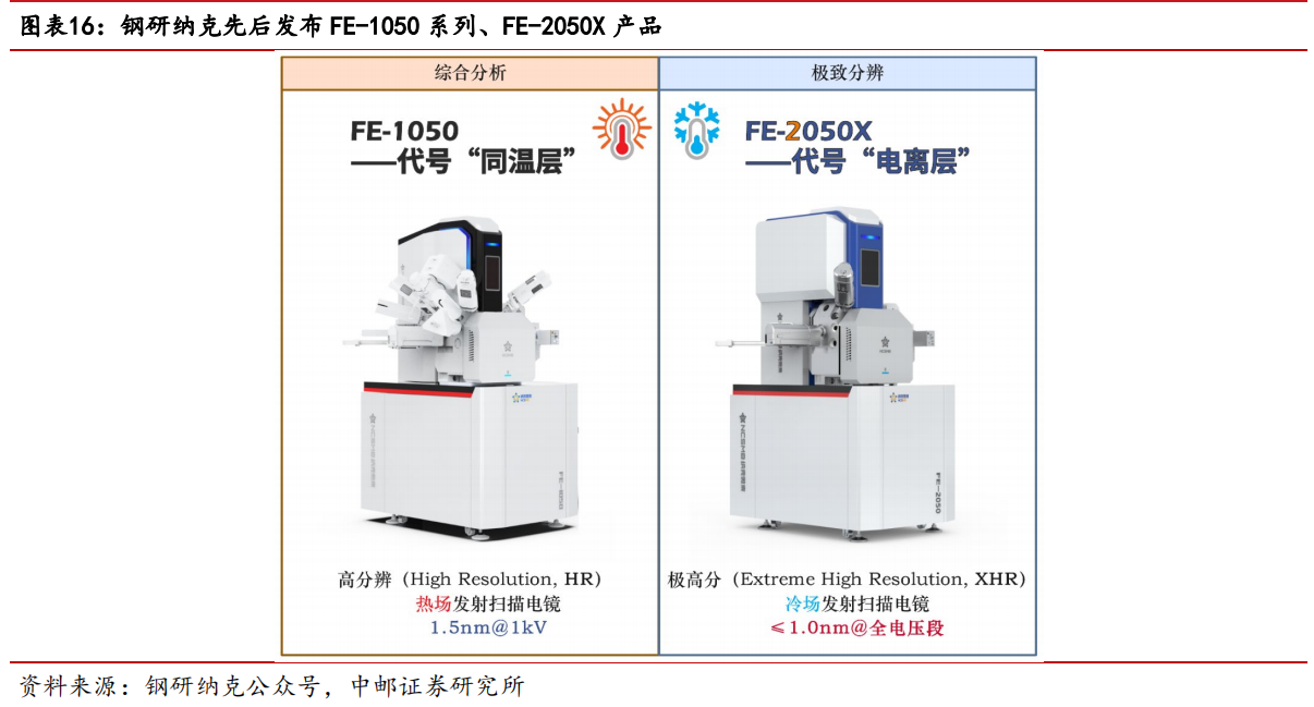 上市公司投资机会方面,钢研纳克子公司纳克微束于11月先后推出国产高分辨(HR)场发射扫描电镜“旗舰机型”——FE-1050系列与极高分辨(XHR)场发射扫描电子显微镜FE-2050X。FE-1050系列与FE-2050X的推出,代表着我国扫描电镜技术与国际先进技术的差距大幅减小。