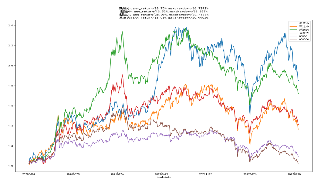 策略在模拟阶段内的收益(不代表未来收益):2020年4月至2022年10月,新进小组合净值超过1.8,重复大组合净值1.4,上证指数和沪深3000指数涨幅都低于10%,策略超额收益显著。新进小组合弹性较大,高峰时净值接近2.4,最大回撤达36.7%。