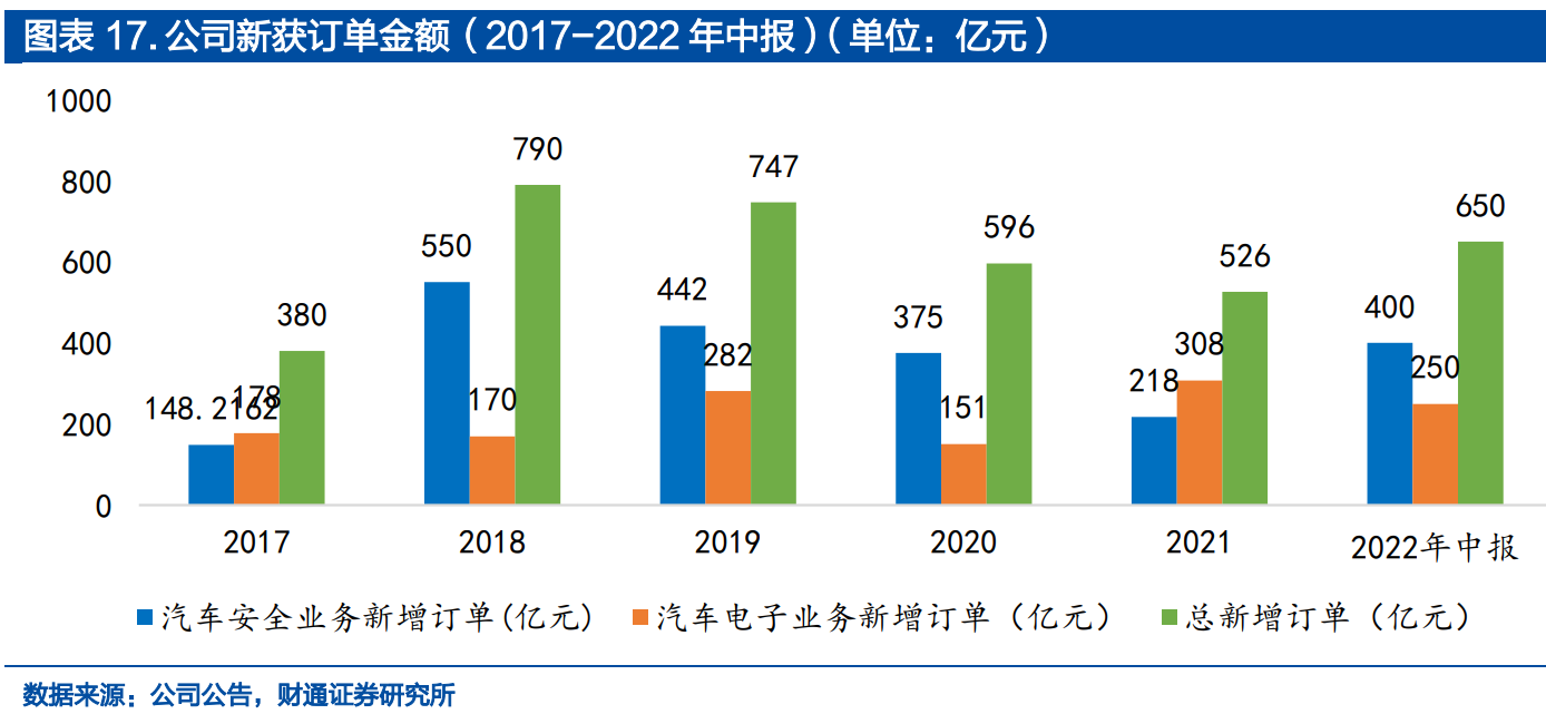 在手订单充足,汽车电子业务订单占比超1/4,新获得全业务订单大幅增长,截至2022年2月在手订单约2950亿元,汽车电子业务在手订单超750亿元,该类业务已进入保时捷、大众、宝马、奔驰、福特、通用、吉利、广汽等全球知名品牌车型,截至2022年中报,公司新获安全业务订单400亿元,电子业务订单250亿元。
