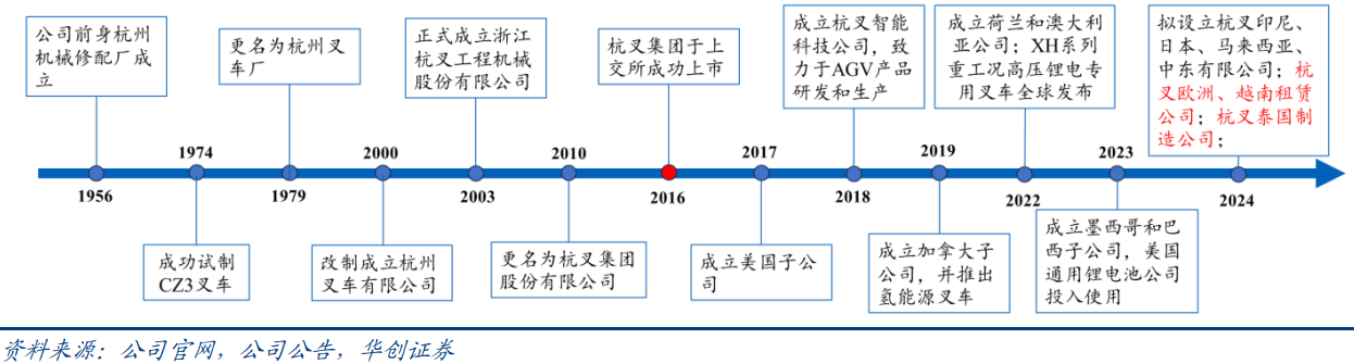 杭叉集团是中国叉车行业的领军企业,起源于1956年的杭州机械修配厂,早期专注于机械修理和装配。1974年,公司成功研制出CZ3叉车,开启了叉车制造的新篇章。1979年,正式更名为杭叉叉车厂,专注于叉车制造。2011年公司引入战投充分赋能,随后公司进入高速发展阶段,于2016年成功在上海证券交易所上市。