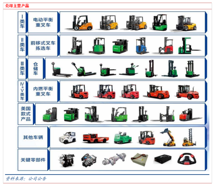 公司是国内叉车龙头之一,在产品、产业链配套、国内外渠道建设方面有一定的优势,目前已布局海外制造基地,具备较好的抗风险能力,看好未来锂电化浪潮下赶超海外巨头。