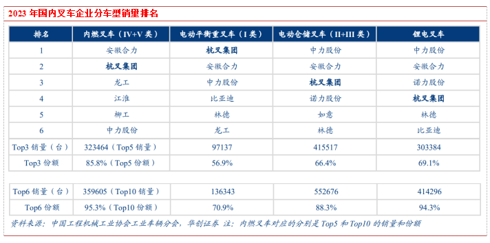公司积极拥抱行业变化,加速电动化、全球化布局,产品覆盖叉车及关键零部件,并建设锂电池充电机智能制造产线,对核心零部件产业链进行延伸。杭叉集团作为行业龙头之一,叉车总销量稳步增长,2023年实现总销量24.5万台,同比增长6.6%,占国内全行业20.9%,位列第二名。