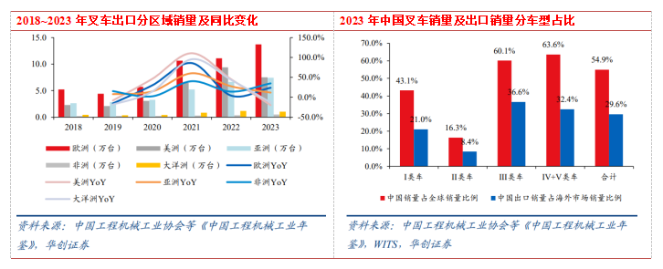 2018~2023年叉车出口分区域销量及同比变化 2023年中国叉车销量及出口销量分车型占比