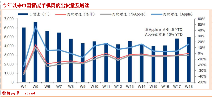 如上图,BCI公布的智能手机周度出货量上来看,今年前4周出货量同比跌幅最大,16周开始同比降幅已经显著收窄,17-18周左右出货量有个拐头,同比降幅继续持稳,并未程扩大态势。