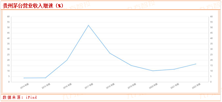 单独看贵州茅台,可以很明显的发现,2016年是其增速开始快速上升的第一年(拐点),2017年其营收增速更是达到了惊人的50%多,虽然此后营收增速逐年下滑,但总体来看2016年后的营收增速要远高于白酒行业低迷的2014-2015年。
