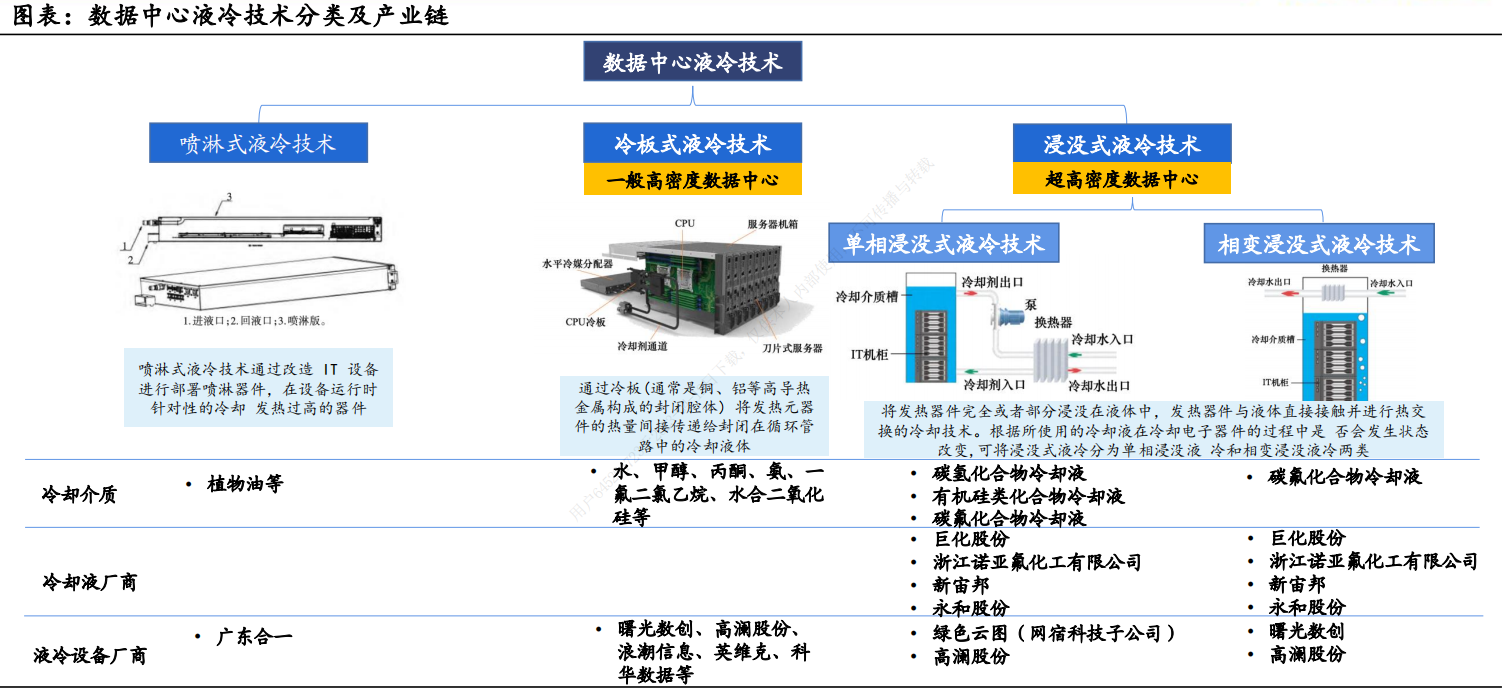 方式上来看,数据中心液冷方式分为冷板式、浸没式及喷淋式。浸没式液冷是直接接触的制冷方式,相较冷板式,更大程度利用液体的比热容特点,制冷效率更高,可有效降低数据中心PUE(电能利用效率)。根据《绿色高能效数据中心散热冷却技术研究现状及发展趋势》,浸没式液冷整体散热性能更优,同时可适配更高功率密度的机柜和数据中心,前景更加广阔。
