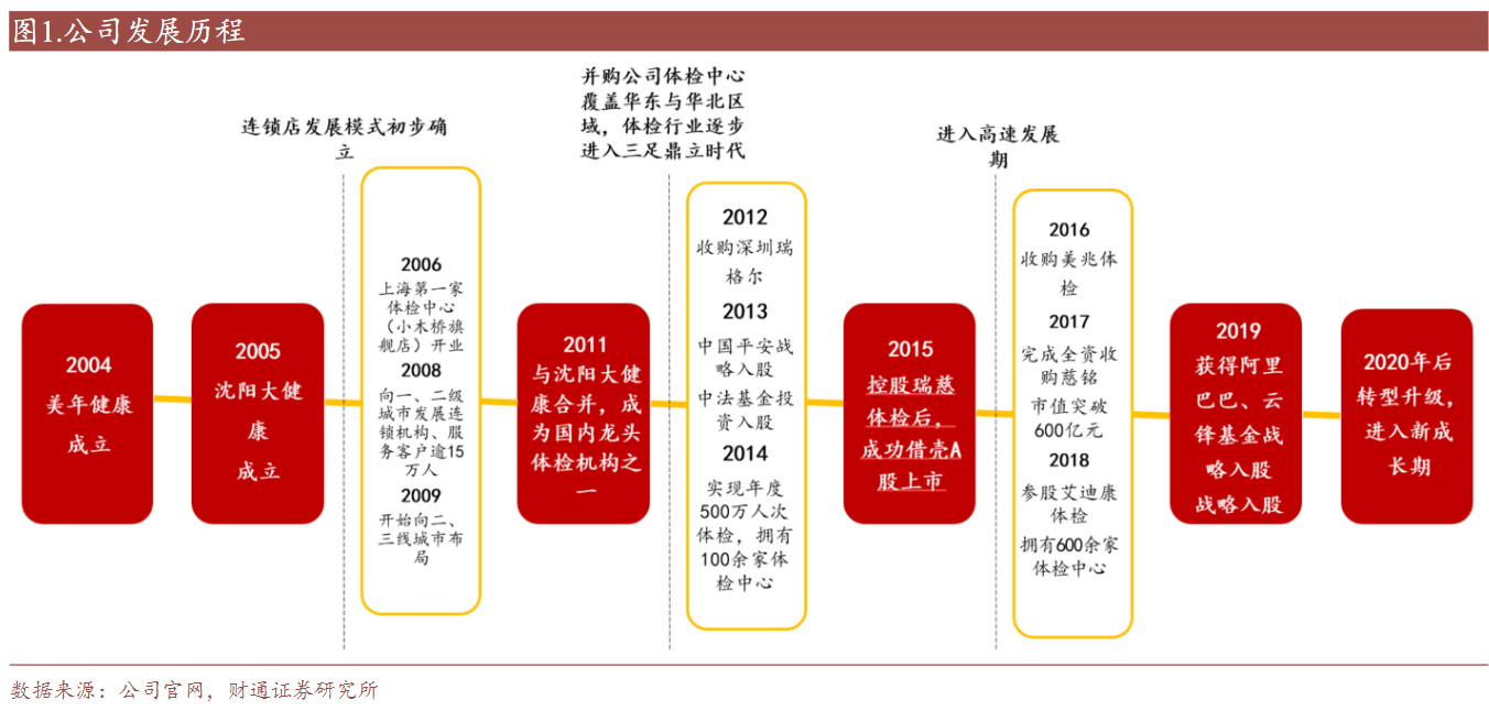 公司多年深耕体检行业,通过“外延+内生”模式快速扩张成为行业龙头之一,提质增量,精耕细作,经过十多年的发展成为中国最大的专业健康体检和医疗服务机构,以高品质、专业的健康体检为基础,以健康大数据为根源,围绕专业预防、健康保障、医疗管家式服务等领域展开多方位、个性化服务。