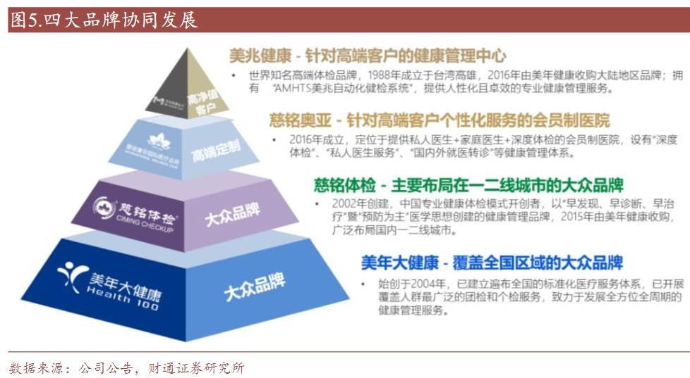公司四大品牌协同发展,打造多层次服务梯队,陆续收购“慈铭体检”、“美兆健康”,并于2016年成立“慈铭奥亚”,形成四大品牌,覆盖由大众至高端的体检需求。其中美年大健康作为大众品牌,覆盖全国区域;慈铭主要覆盖一二线城市;慈铭奥亚及美兆健康则注于为中高端团体客户和高端个人客户提供个性化、定制化产品。