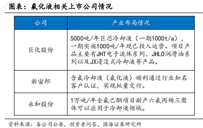 国内上市公司中,巨化股份是中国氟化工领先企业,氟致冷剂全球龙头。公司是国内用自有技术实现第四代氟致冷剂产业化生产的企业,拥有5000吨/年巨芯冷却液,一期实施1000吨/年现已投入运营。两外,新宙邦氟化液顺利通过行业知名客户认证,实现批量交付。
