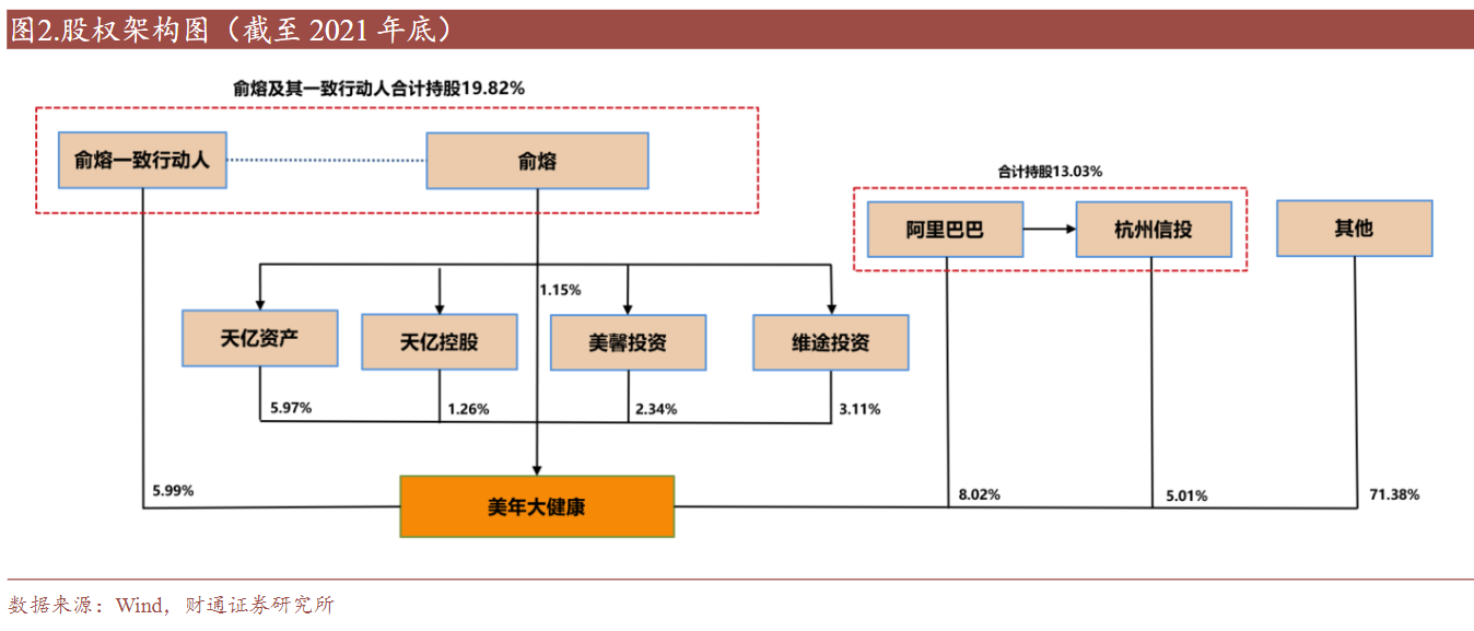 阿里巴巴为战略大股东,董事长俞熔为公司实际控制人。截至2021年底,公司董事长俞熔及其一致行动人合计持股比例为19.82%,对公司拥有实际控制权,阿里巴巴是公司第一大股东,与其一致行动人杭州信投合计持股比例13.03%,持续赋能公司数字化管理及互联网平台建设。