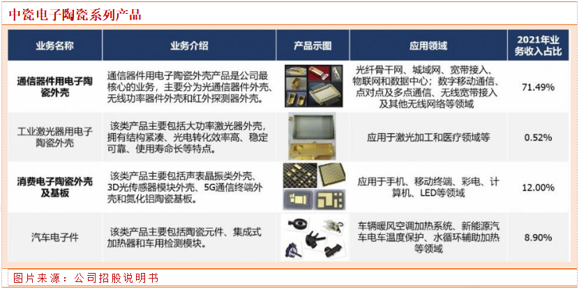 公司专注于从事电子陶瓷系列产品的研发、生产和销售,主要产品可分为:通信器件用电子陶瓷外壳、工业激光器用电子陶瓷外壳、消费电子陶瓷外壳及基板、汽车电子件四大系列。通信电子陶瓷外壳特别是光模块陶瓷外壳作为公司“拳头产品”,占收入比例较高,且相对稳定。