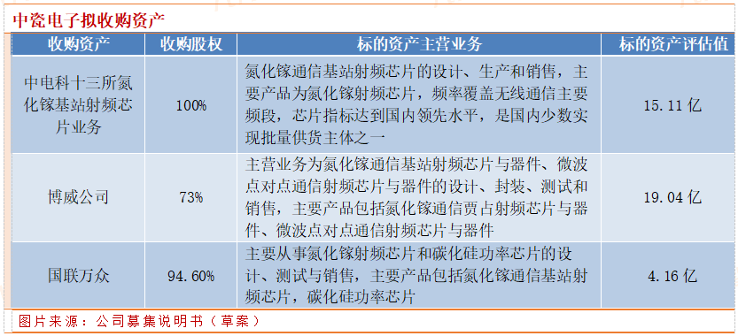 2022年1月,公司发布公告拟收购控股股东中电科十三所氮化镓/碳化硅资产,进入三代半导体新赛道。2022年8月,公司公布《河北中瓷电子科技股份有限公司发行股份购买资产并募集配套资金暨关联交易报告书(草案)》,拟向中国电科十三所发行股份购买其持有的博威公司73.00%股权、氮化镓通信基站射频芯片业务资产及负债,拟向中国电科十三所、数字之光、智芯互联、电科投资、首都科发、顺义科创、国投天津发行股份购买其合计持有的国联万众94.6029%股权。