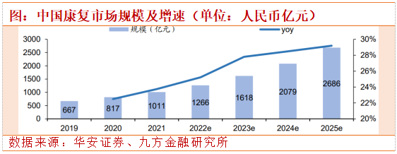 据艾瑞咨询数据,2019年中国康复医疗市场规模为667亿元左右,2021达到1011亿元,接近100%的增长,环比23.75%的增速,CAGR为高达23.12%,而预测2025规模将会继续增长至2686亿元,未来三年CAGR预计28.50%,可见国内康复市场仍处于早期发展阶段,同时也意味着未来无限的培育空间。