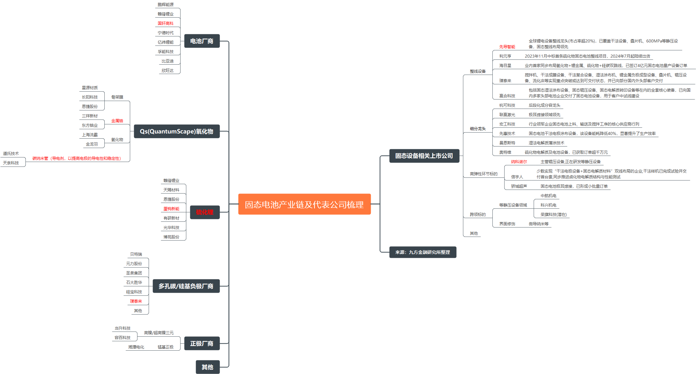 固态电池产业化逐步落地,各环节相关上市公司如下: