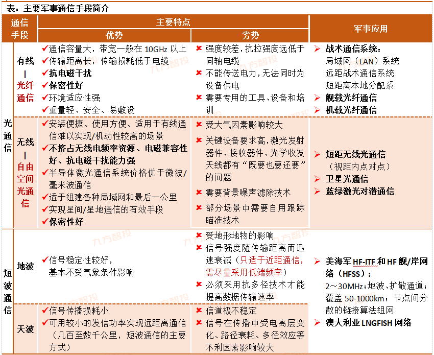纵观当前主要军用通信系统,该领域包含了三个大类,并且存在两大重点基础设施类型。纵观当前军事通信手段特性,就具体的传输信道而言,现代军事通信系统基础设施主要聚焦于两个方面——以光纤通信为主的有线通信和基于各类无线电频段特性的无线通信。